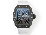 RM12-01 NTPT Tourbillon Extraordinary Sports Skeleton Streamlined Watch Richard Mille revisits the legendary RM012 movement, integrating innovation in materials with watch architecture. The RM12-01 Tourbillon watch features the RM12-01 Tourbillon watch and is available in a variety of different limited editions exclusively in boutiques in the Americas. The case structure of the new RM12-01 Tourbillon watch follows the tripartite principle, which combines all the cases together. The lines of the movement are inspired by the structural form of architectural design, and the tubular inclined structure provides optimal rigidity and torsional rigidity, as well as excellent heat resistance and corrosion resistance. The function of the bottom plate is uniquely combined with that of the movement and bridge to form a technically coherent and visually inseparable whole. The movement is proudly displayed through a perfect combination of grinding, satin finishing, circular finishing and high polishing. Its one-piece bottom plate is inspired by the chassis of racing cars and improves rigidity and shock resistance. The sharp streamlined curves of the skeletonized bridges that surround the barrel, large wheel and tourbillon radiate to the end of the manual winding movement. The RM12-01 limited edition case measures approximately 51x42x15mm and is available in black carbon TPT, red quartz TPT, and white quartz TPT.